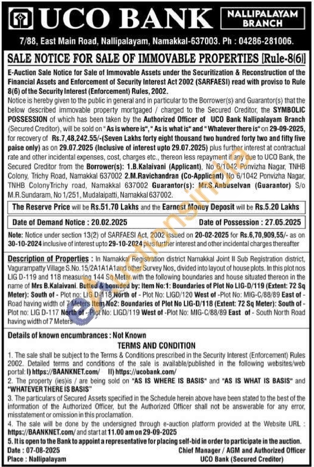 Description of Properties: In Namakkal Registration district Namakkal Joint II Sub Registration district, Vagurampatty Village S.No. 15/2A1A1A1and other Survey Nos, divided into layout of house plots. In this plot nos LIG D-119 and 118 measuring 144 Sq Meter with the following boundaries and house situated thereon in the name of Mrs B.Kalaivani. Butted & bounded by: Item No:1: Boundaries of Plot No LIG-D/119 (Extent: 72 Sq Meter): South of Plot no: LIG D-118 North of Plot No: LIGD/120 West of -Plot No: MIG-C/88/89 East of -Road having width of 7 Meters Item No2: Boundaries of Plot No LIG-D/118 (Extent: 72 Sq Meter): South of -Plot no: LIG D-117 North of Plot No: LIGD/119 West of -Plot No: MIG-C/88/89 East of South North Road having width of 7 Meters
