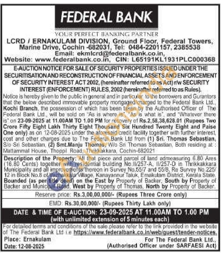 Description of the Property: All that piece and parcel of land admeasuring 6.80 Ares (16.80 Cents) together with residential building No.II/257-A, II/257-D in Thrikkakkara Municipality and all improvements thereon in Survey No.55/7 and 55/8, Re Survey No. 225/12 in Block No.8 of Vazhakkala Village, Kanayannur Taluk, Emakulam District, Kerala State Bounded (as per title deed) on the East by Property of Backer, South by Property of Backer and Municipal Road, West by Property of Thomas, North by Property of Backer