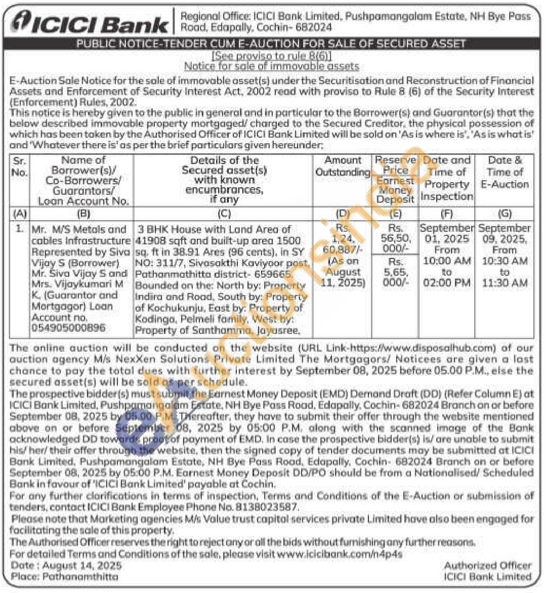3 BHK House with Land Area of 41908 sqft and built-up area 1500 sq. ft in 38.91 Ares (96 cents), in SY NO: 311/7, Sivasakthi Kaviyoor post, Pathanmathitta district- 659665. Bounded on the: North by: Property Indira and Road, South by: Property of Kochukunju, East by: Property of Kodinga, Pelmeli family, West by: Property of Santhamma, Jayasree