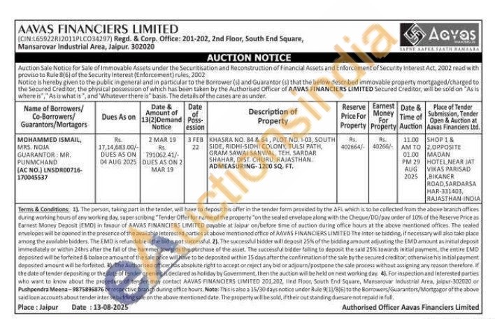 KHASRA NO. 84 & 64, PLOT NO. 103, SOUTH SIDE, RIDHI-SIDHI COLONY, LONY, TULSI TULSI PATH, GRAM SAWAI SANWAL, TEH. SARDAR SHAHAR, DIST CHURU, RAJASTHAN. ADMEASURING-1200 SQ. FT.