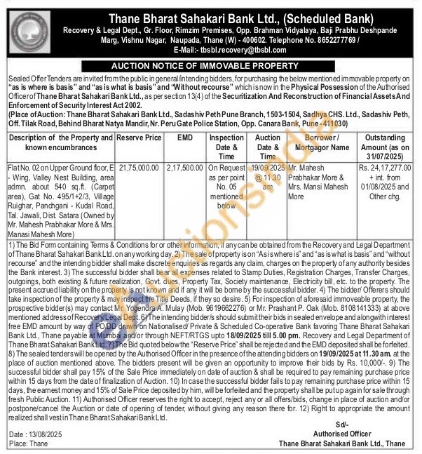 Flat No. 02 on Upper Ground floor, E Wing, Valley Nest Building, area admn. about 540 sq.ft. (Carpet area), Gat No. 495/1+2/3, Village Ruighar, Panchgani - Kudal Road, Tal. Jawali, Dist Satara (Owned by Mr. Mahesh Prabhakar More & Mrs. Manasi Mahesh More)