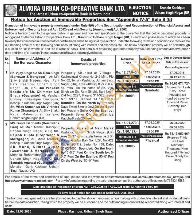 Property Situated at Village Kachnalgazi Khasra No: 245 Min., Plot No: 02, Tehsil - Kashipur, Udham Singh Nagar, (UK), Area 2480 sq. ft. or 230.48 sq. mtrs., (In the name of Sh. Vijay Singh s/o Sh. Ram Singh), Bahi No: 1, Zild No: 2297, Pages: 311-328, Serial No: 8977, Dated 14.10.2010. Bounded: On the North by: Property Daya Tiwari & Anita Devi On the South by: Property Seller On the East by: Property Seller On the West by: Kaccha Rasta 25 Feet