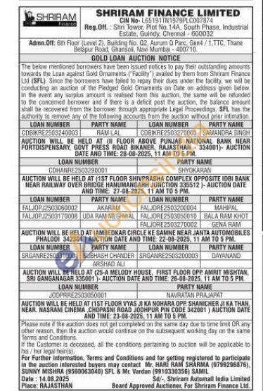 Shriram Finance Ltd Gold Auctions Auction in Bikaner