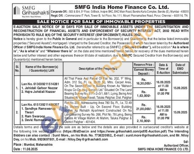 All That Piece And Parcel Of Flat No. 202, 'F' Wing, Adm. 312 Sq. Ft. i.e. 29.00 Sq. Mtrs. Carpet Area, On The Second Floor In Building Known As "Mahavir Krupa Co-Op. Hsg. Society Ltd." Situated On The Land Bearing Survey No. 51/1+2+3/1, 68/1, Lying, Being And Situated At Village Navali, Taluka Palghar, Dist. Palghar