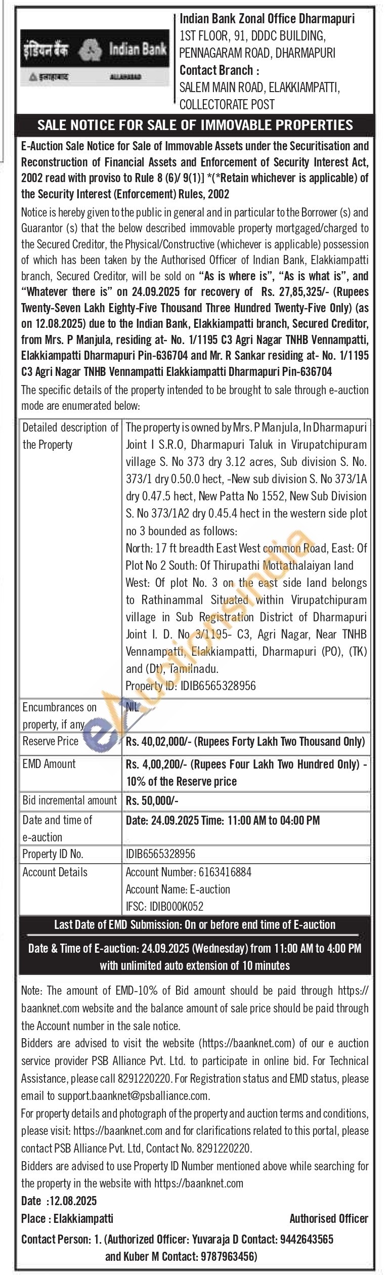 The property is owned by Mrs. P Manjula, In Dharmapuri Joint I S.R.O, Dharmapuri Taluk in Virupatchipuram village S. No 373 dry 3.12 acres, Sub division S. No. 373/1 dry 0.50.0 hect, -New sub division S. No 373/1A dry 0.47.5 hect, New Patta No 1552, New Sub Division S. No 373/1A2 dry 0.45.4 hect in the western side plot no 3 bounded as follows: North: 17 ft breadth East West common Road, East: Of Plot No 2 South: Of Thirupathi Mottathalaiyan land West: Of plot No. 3 on the east side land belongs to Rathinammal Situated within Virupatchipuram village in Sub Registration District of Dharmapuri Joint I. D. No 3/1195- C3, Agri Nagar, Near TNHB Vennampatti, Elakkiampatti, Dharmapuri (PO), (TK) and (Dt), Tamilnadu.