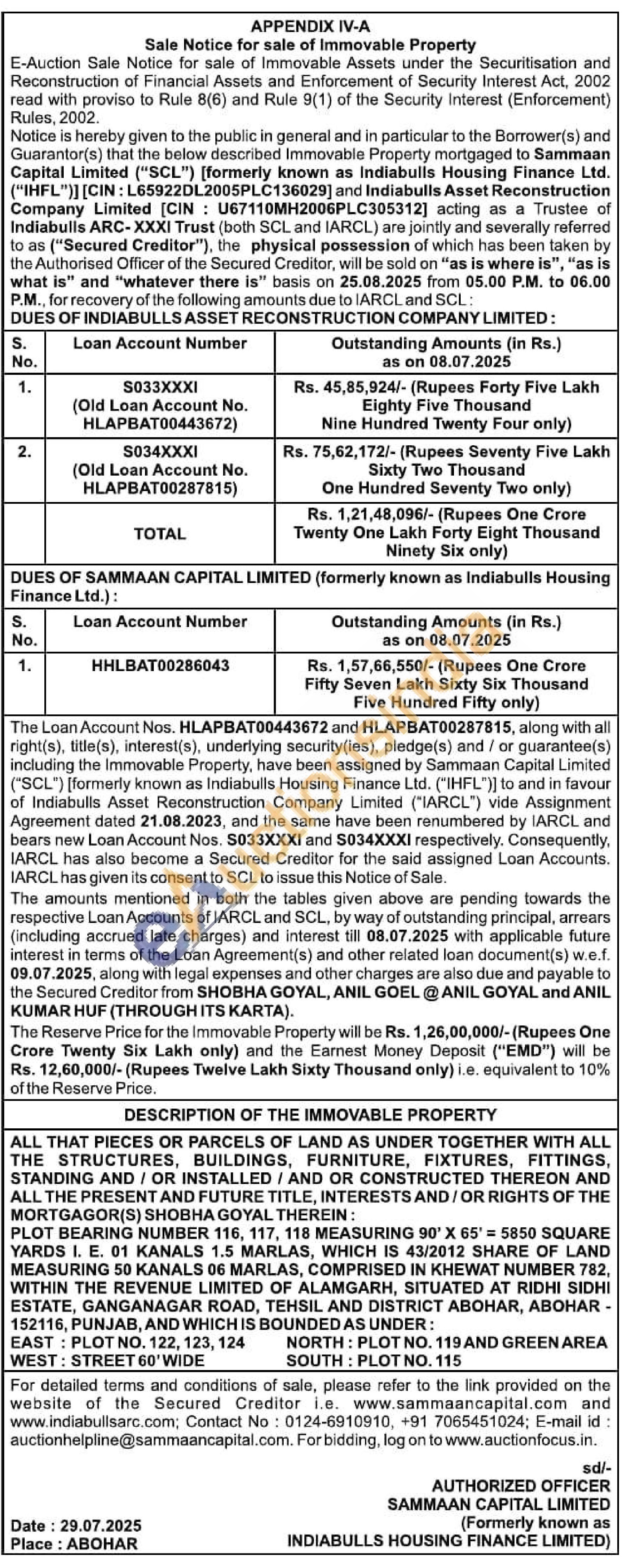 ALL THAT PIECES OR PARCELS OF LAND AS UNDER TOGETHER WITH ALL THE STRUCTURES, BUILDINGS, FURNITURE, FIXTURES, FITTINGS, STANDING AND/OR INSTALLED / AND OR CONSTRUCTED THEREON AND ALL THE PRESENT AND FUTURE TITLE, INTERESTS AND/OR RIGHTS OF THE MORTGAGOR(S) SHOBHA GOYAL THEREIN: PLOT BEARING NUMBER 116, 117, 118 MEASURING 90' X 65'5850 SQUARE YARDS I. E. 01 KANALS 1.5 MARLAS, WHICH IS 43/2012 SHARE OF LAND MEASURING 50 KANALS 06 MARLAS, COMPRISED IN KHEWAT NUMBER 782. WITHIN THE REVENUE LIMITED OF ALAMGARH, SITUATED AT RIDHI SIDHI ESTATE, GANGANAGAR ROAD, TEHSIL AND DISTRICT ABOHAR, ABOHAR - 152116, PUNJAB.