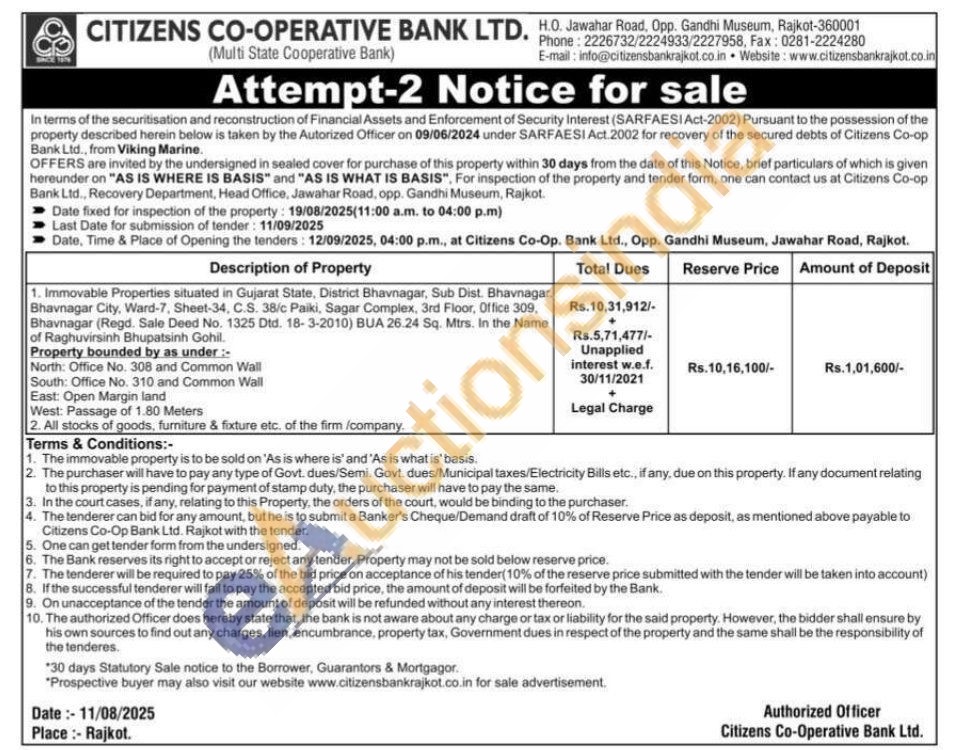 1. Immovable Properties situated in Gujarat State, District Bhavnagar, Sub Dist. Bhavnagar Bhavnagar City, Ward-7, Sheet-34, C.S. 38/c Paiki, Sagar Complex, 3rd Floor, Office 309, Bhavnagar (Regd. Sale Deed No. 1325 Dtd. 18-3-2010) BUA 26.24 Sq. Mtrs. In the Name of Raghuvirsinh Bhupatsinh Gohil. Property bounded by as under :- North: Office No. 308 and Common Wall South: Office No. 310 and Common Wall East: Open Margin land West: Passage of 1.80 Meters 2. All stocks of goods, furniture & fixture etc. of the firm /company
