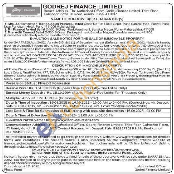 All Those Piece and Parcel of Property Bearing Office No. 101, First Floor, Area Admeasuring 2600 Sq. Ft. (Built Up) Lotus Court, Final Plot No. 477. T.P. Scheme No. 3, C.T.S. No. 4618, S. No.: 42/A/3/2A, Parvati, Tq. Haveli, Dist. Pune. (State of Maharashtra) is Bounded As Under: East- By Pune Satara Road, West-By Property Bearing Final Plot No. 631/2. North By T.P. Scheme Road, South-By Jakat Naka and Property of Parvati Industrial Estate.