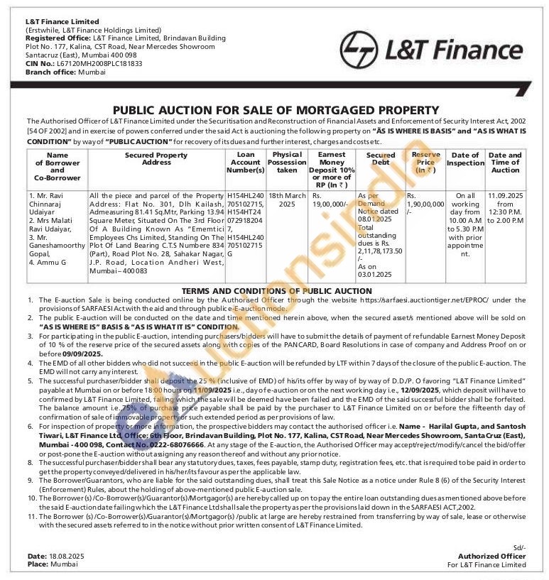 All the piece and parcel of the Property Address: Flat No. 301, Dih Kailash, Admeasuring 81.41 Sq.Mtr, Parking 13.94 Square Meter, Situated On The 3rd Floor Of A Building Known As "Ememtici 7, Employees Chs Limited, Standing On The Plot Of Land Bearing C.T.S Numbere 834 (Part), Road Plot No. 28, Sahakar Nagar, G J.P. Road, Location Andheri West, Mumbai-400083