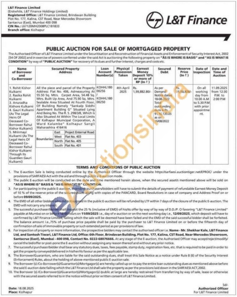 All the piece and parcel of the Property Address: Fiat No. 406, Admeasuring At 55.50 Sq. Mtrs. Carpet Area, 54.48 5q/Mtrs. Built Up Area, And 75.90 5q. Mtrs. Sealable Area Situated At Fourth Floor, Of Building Namely "Sankalp Siddhi Apartment Building G" Situated Lying And Being No. The R. 5. 298/3/8, Which is Also Situated At Within The Local Limits Of Kolhapur Mumcipal Corporation, A Ward Kalambe" Kolhapur Sangli Maharashtra 416416