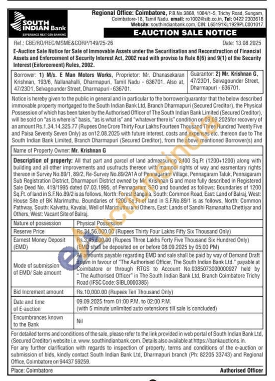 Description of property: All that part and parcel of land admeasuring 2400 Sq.Ft (1200+1200) along with building and all other improvements and usufructs thereon with mamool rights of way and easmentary rights thereon in Survey No.89/1, 89/2, Re-Survey No.89/2A1A of Pennagaram Village, Pennagaram Taluk, Pennagaram Sub Registration District, Dharmapuri District owned by Mr. Krishnan G and more fully described in Registered Sale Deed No. 419/1995 dated 07.03.1995, of Pennagaram SRO and bounded as follows: Boundaries of 1200 Sq.Ft. of land in S.F.No.89/2 is as follows, North: Forest Bangala, South: Common Road, East: Land of Balraj, West: House Site of BK Marimuthu. Boundaries of 1200 Sq.Ft of land in S.F.No.89/1 is as follows, North: Common Pathway, South: Kalvettu, Kavalai, Well of Marimuthu and Others, East: Lands of Sandhi Ramanatha Chettiyar and Others, West: Vacant Site of Balraj.