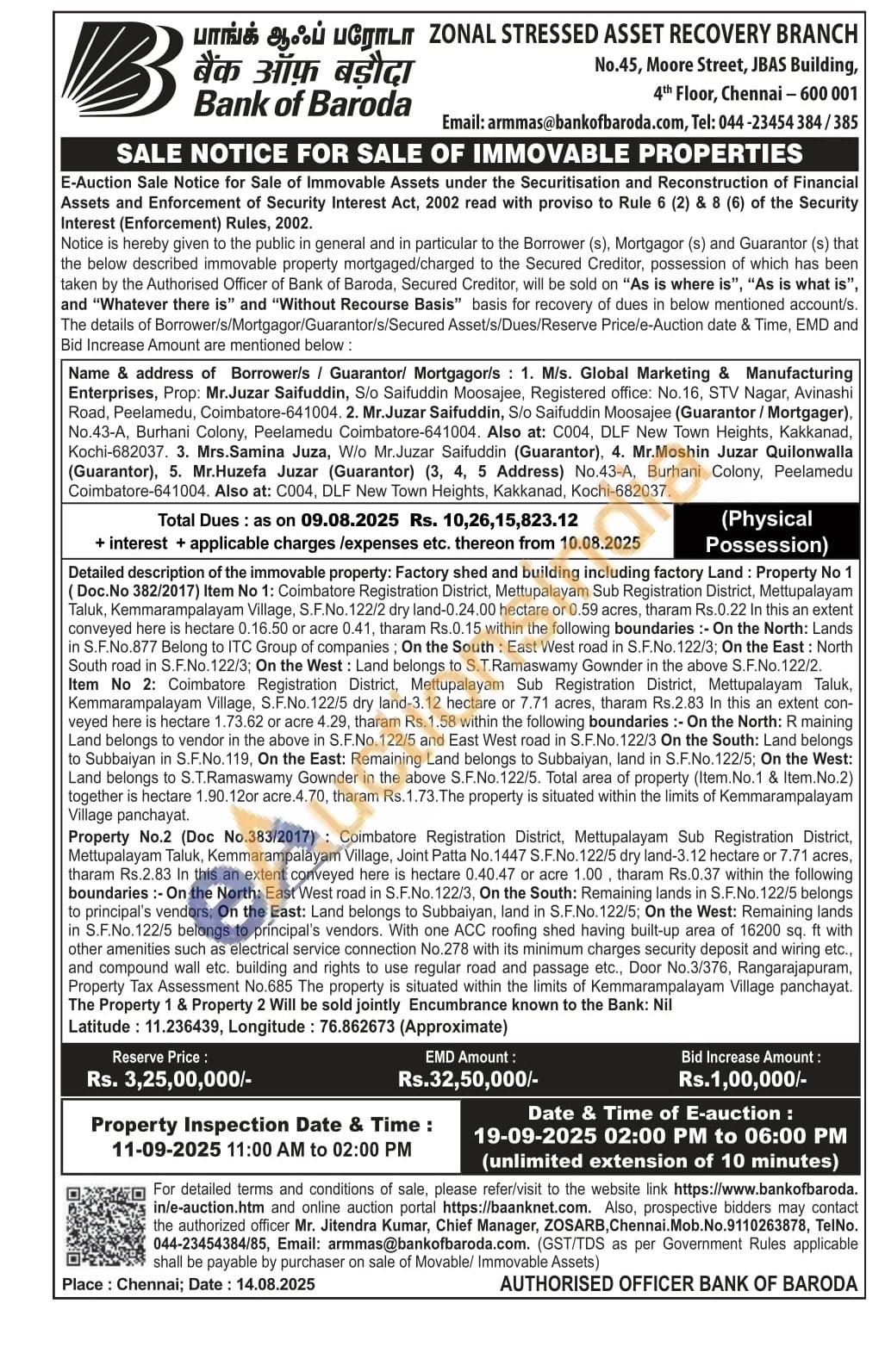 Detailed description of the immovable property: Factory shed and building including factory Land: Property No 1 (Doc.No 382/2017) Item No 1: Coimbatore Registration District, Mettupalayam Sub Registration District, Mettupalayam Taluk, Kemmarampalayam Village, S.F.No. 122/2 dry land-0.24.00 hectare or 0.59 acres, tharam Rs.0.22 In this an extent conveyed here is hectare 0.16.50 or acre 0.41, tharam Rs.0.15 within the following boundaries: On the North: Lands in S.F.No.877 Belong to ITC Group of companies: On the South East West road in S.F.No. 122/3; On the East: North South road in S.F.No. 122/3; On the West: Land belongs to S.T.Ramaswamy Gownder in the above S.F.No. 122/2. Item No 2: Coimbatore Registration District, Mettupalayam Sub Registration District, Mettupalayam Taluk, Kemmarampalayam Village, S.F.No.122/5 dry land-3.12 hectare or 7.71 acres, tharam Rs.2.83 In this an extent con-veyed here is hectare 1.73.62 or acre 4.29, tharam Rs.1.58 within the following boundaries: On the North: R maining Land belongs to vendor in the above in S.F.No. 122/5 and East West road in S.F.No. 122/3 On the South: Land belongs to Subbaiyan in S.F.No. 119, On the East: Remaining Land belongs to Subbaiyan, land in S.F.No.122/5; On the West: Land belongs to S.T.Ramaswamy Gownder in the above S.F.No.122/5. Total area of property (Item.No.1 & Item. No.2) together is hectare 1.90.12or acre.4.70, tharam Rs.1.73. The property is situated within the limits of Kemmarampalayam Village panchayat
