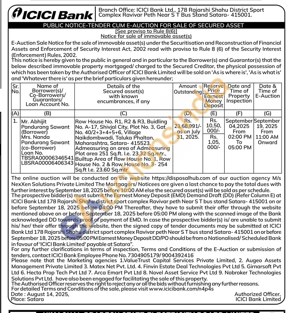 Row House No. R1, R2 & R3, Buidling No. A-17, Shivjal City, Plot No. 3, Gat No. 40/2+3+4+5+6, Village Naikdombwadi, Taluka Phaltan, Maharashtra, Satara-415523. Admeasuring an area of Admeasuring Plot area 251 Sq.ft. l.e. 23.32 Sq.mtr., Builtup Area of Row House No. 1, Row House No. 2 & Row House No. 3- 254 Sq.ft l.e. 23.60 Sq.mtr