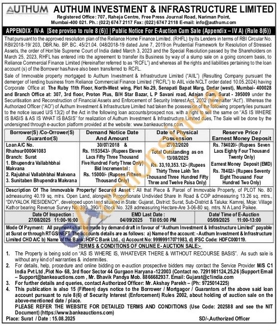 contact Authorized Officer: Mr. Akshay Parekh (Ph: 9725014225)