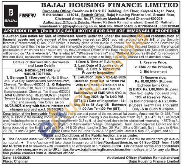 Contact Authorized Officer's Details: Name: Rathish Ramachandran Mob No. 9940156469 & 8778385461, 8669189048