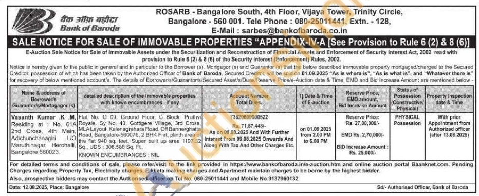 contact the Authorised officer on Tel No. 080-25011441 and Mobile No.9137960132