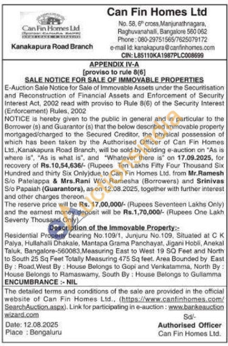 Residential Property bearing No. 109/1, Junjuru No.109, Situated at CK Palya, Hullahalli Dhakale, Mantapa Grama Panchayat, Jigani Hobli, Anekal Taluk, Bangalore-560083, Measuring East to West 19 SQ Feet and North to South 25 Sq Feet Totally Measuring 475 Sq feet. Area Bounded by East By: Road, West By: House Belongs to Gopi and Venkatamma, North By: House Belongs to Ramaswamy, South By: House Belongs to Gullamma ENCUMBRANCE :- NIL