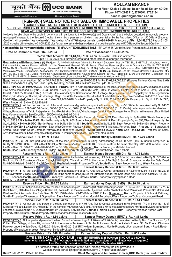 DESCRIPTION OF IMMOVABLE PROPERTY- PROPERTY - 3 All that part and parcel of the land & commercial building admeasuring of 63.30 Ares (156.35 Cents) comprised in Re.Sy.No.30/10, 30/14, & 30/4 in Block No.24, of Navaikulam Village, Varkala TK, Trivandrum DT in the name of Mr Saji S S/o Mr Surendran under the Sale Deed No.662/2011 dated 09-03-2011 at SRO Navaikulam. Bounded: North-Property of Malik Muhmmed South-Road, East-Property of Arun & Shylaja, West-Property of Saji, Asadevi, Purushothaman Pillai & others