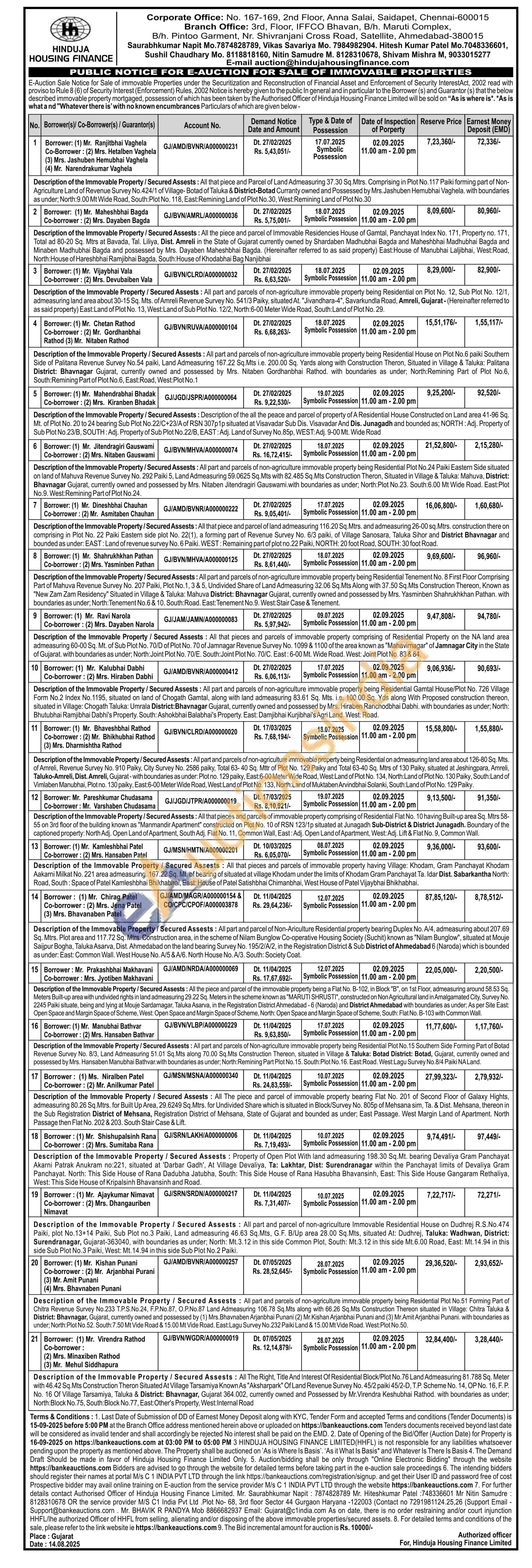 Description of the Immovable Property/Secured Assests: All the piece and parcel of Immovable Residencies House of Gamtal, Panchayat Index No. 171, Property no. 171, Total ad 80-20 Sq. Mtrs at Bavada, Tal. Liliya, Dist. Amreli in the State of Gujarat currently owned by Shardaben Madhubhai Bagda and Maheshbhai Madhubhai Bagda and Minaben Madhubhai Bagda and possessed by Mrs. Dayaben Maheshbhai Bagda. (Hereinafter referred to as said property) East:House of Manubhai Laljibhai, West Road, North House of Hareshbhai Ramjibhai Bagda, South: House of Khodabhai Bag Nanjibhai