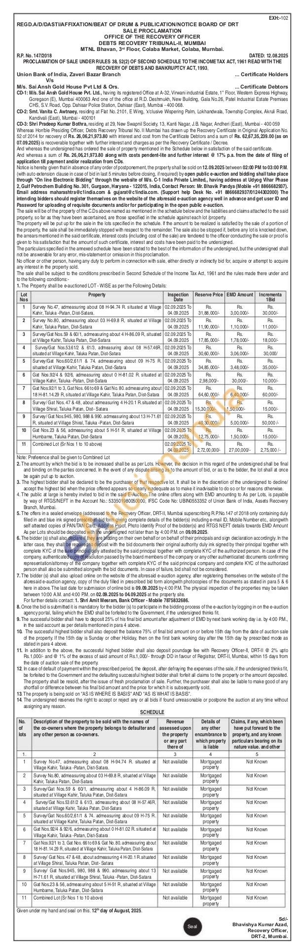 Lot Nos : 11 Combined Lot (Sr Nos 1 to 10 above)