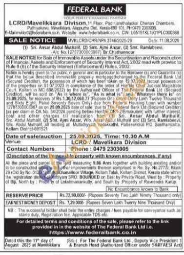 All the piece and parcel of the land measuring 9.86 Ares together with bulding existing and/or to be constructed along with further improvements thereon comprised in Re. Sy. No 27759), Block 29 (Old Sy No. 3120/1) of Adichanalloor Village, Kolam Taluk, Koltam District, Kerala state within the registration district of Kolblyam SRO BOUNDED on East by Private Road, West by: Property of Biji. North by Properly of Lekshmanankutty, and South by Property of Raveendra Kurup