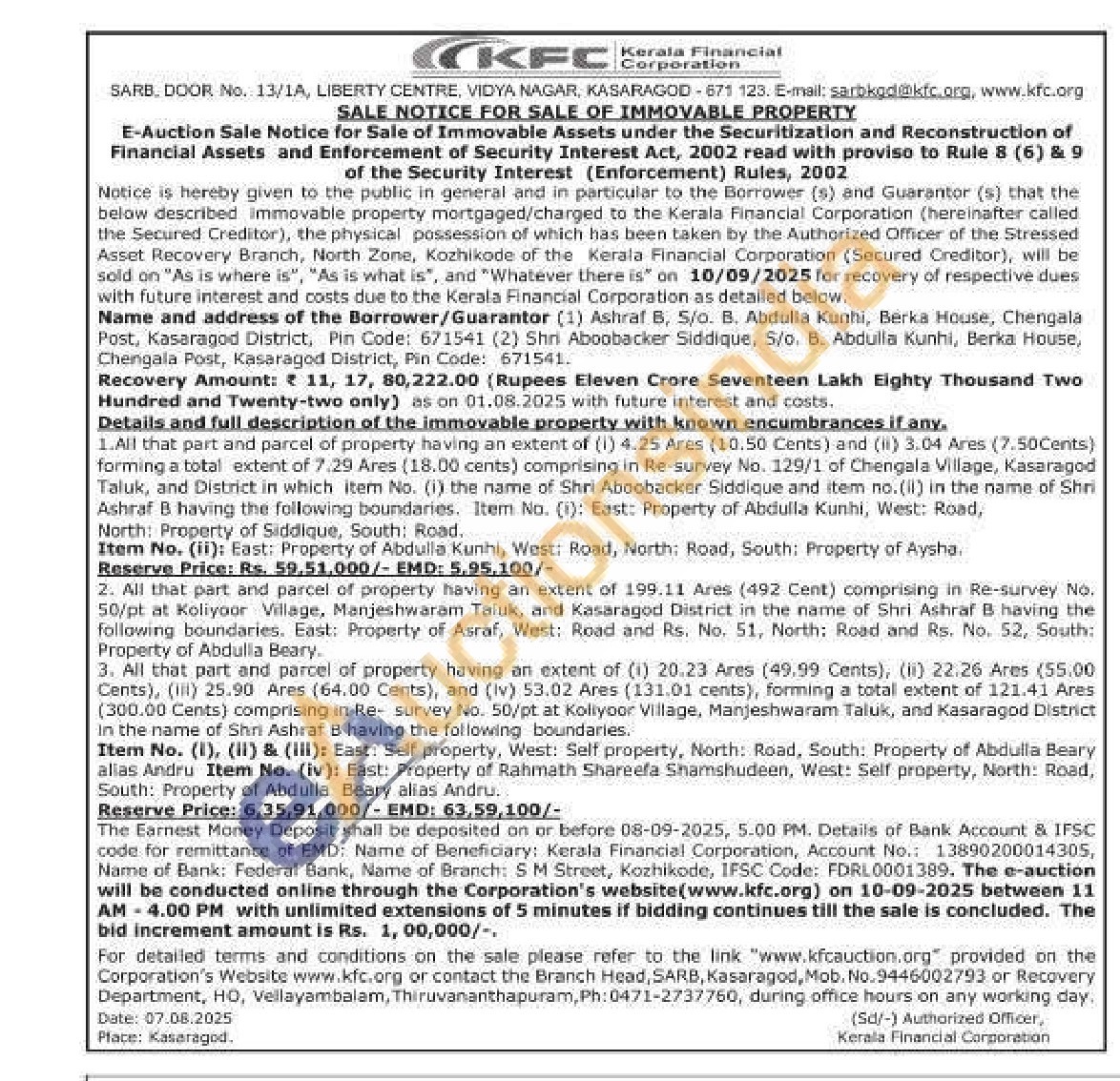 2. All that part and parcel of property having an extent of 199.11 Ares (492 Cent) comprising in Re-survey No. 50/pt at Koliyoor Village, Manjeshwaram Taluk, and Kasaragod District in the name of Shri Ashraf B having the following boundaries. East: Property of Asraf, West: Road and Rs. No. 51, North: Road and Rs. No. 52, South: Property of Abdulla Beary.
