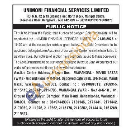 Unimoni Financial Services Limited Gold Auctions Auction in Warangal