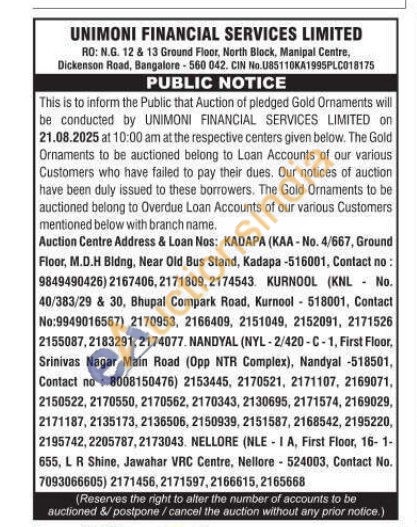 Unimoni Financial Services Limited Gold Auctions Auction in Kadapa
