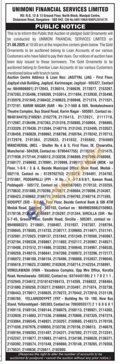 Unimoni Financial Services Limited Gold Auctions Auction in Karimnagar