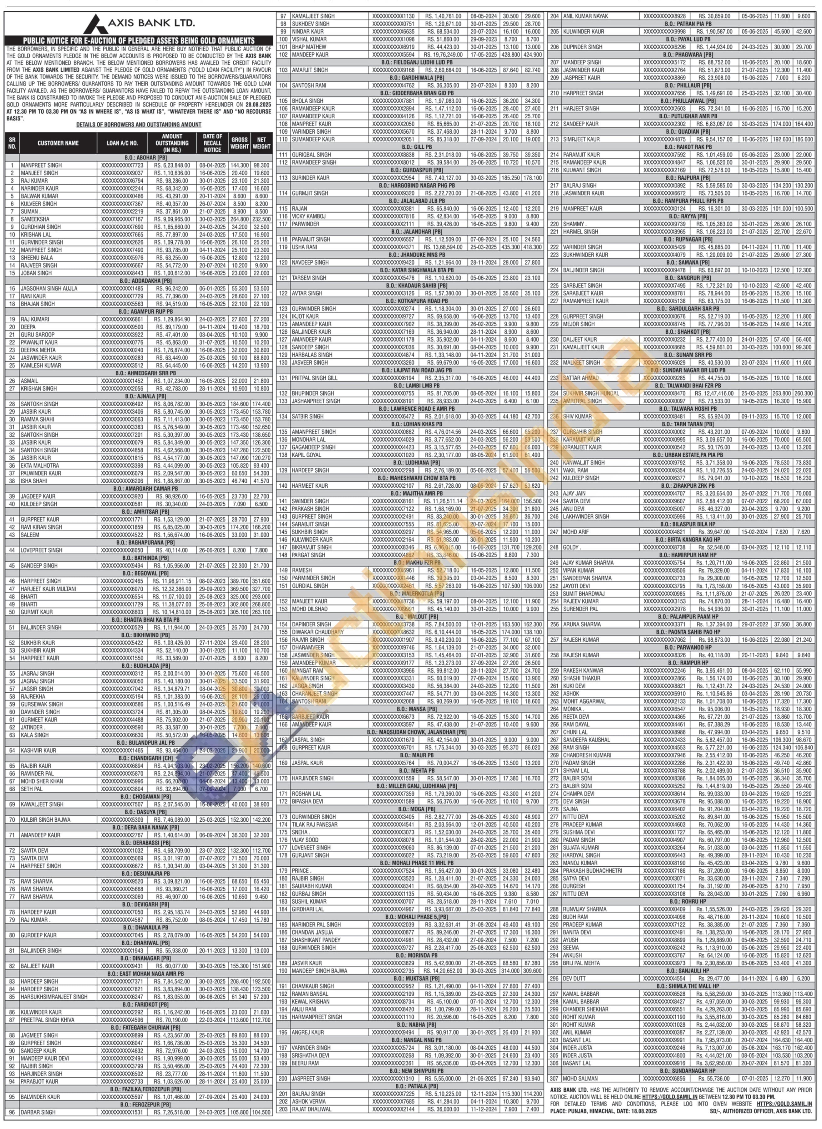 Axis Bank Gold Auctions Auction in Ludhiana