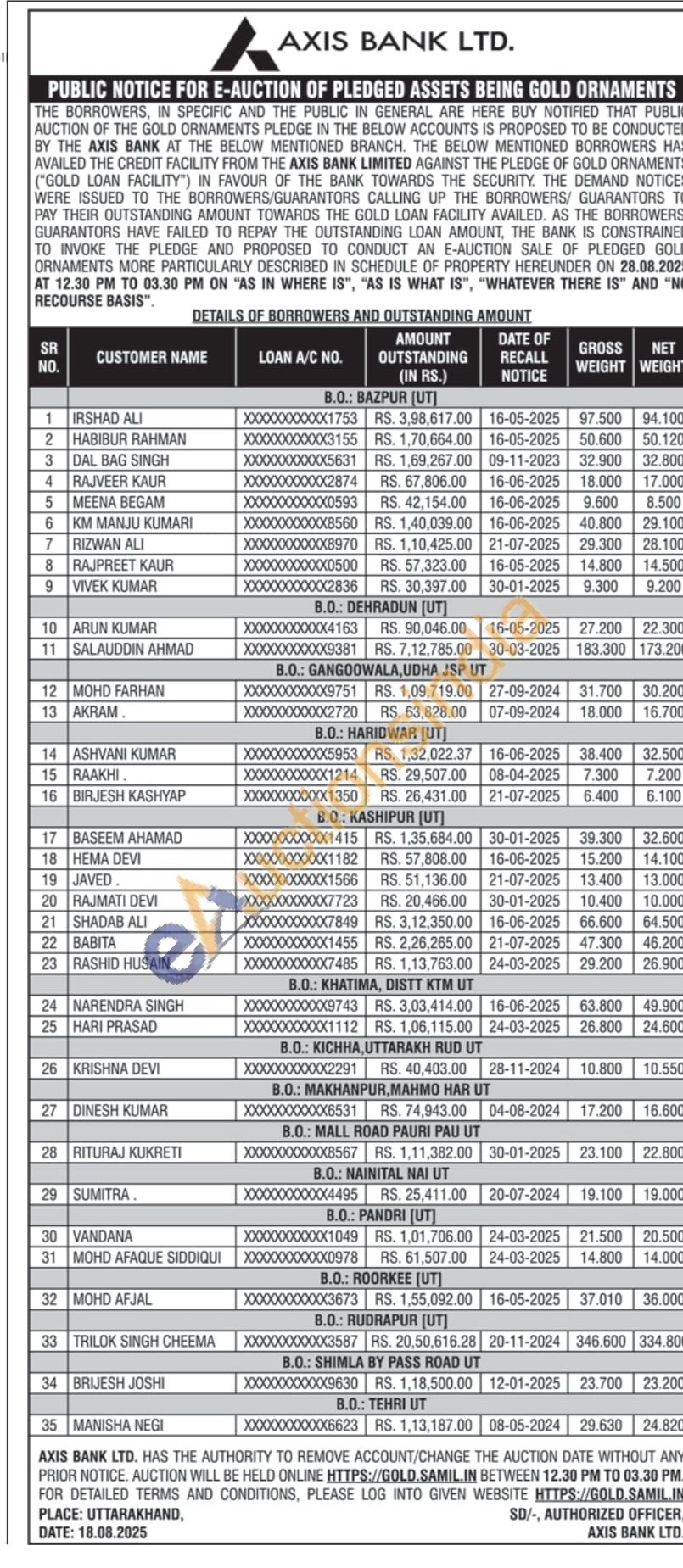 Axis Bank Gold Auctions Auction in Dehradun