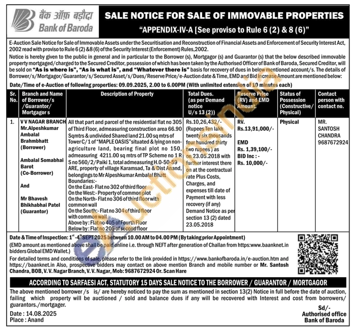 All that part and parcel of the residential flat no 305 of Third Floor, admeasuring construction area 66.90 Sqmtrs & undivided Shared land 21.00 sq mtrs of Tower C/1 of "MAPLE OASIS"situated & lying on non agriculture land, bearing final plot no 150, admeasuring 4211.00 sq mtrs of TP Scheme no 1 R Sno 560/2/Paiki 1, total admeasuring H.0-50-59 ARE, property of village Karamsad, Ta & Dist Anand, belongings to Mr Alpeshkumar Ambalal Bhatt Boundaries:- On the East-Flat no 302 of third floor On the West:-Property of common plot On the North-Flat no 306 of third floor with common wall On the South:-Flat no 304 of third floor with common wall Above by: Flat no 405 of Fourth Floor Below by: Flat no 205 of second floor