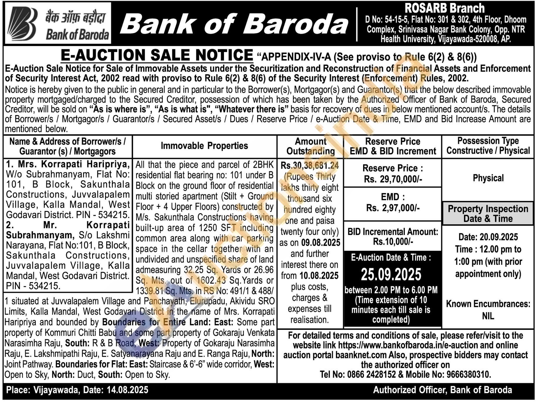 All that the piece and parcel of 2BHK residential flat bearing no: 101 under B Block on the ground floor of residential multi storied apartment (Stilt + Ground Floor + 4 Upper Floors) constructed by M/s. Sakunthala Constructions having built-up area of 1250 SFT including common area along with car parking space in the cellar together with an undivided and unspecified share of land admeasuring 32.25 Sq. Yards or 26.96 Sq. Mts. out of 1602.43 Sq. Yards or 1339.81 Sq. Mts. in RS No: 491/1 & 488/1 situated at Juvvalapalem Village and Panchayath, Elurupadu, Akividu SRO Limits, Kalla Mandal, West Godavari District in the name of Mrs. Korrapati Haripriya and bounded by Boundaries for Entire Land: East: Some part property of Kommuri Chitti Babu and some part property of Gokaraju Venkata Narasimha Raju, South: R & B Road, West: Property of Gokaraju Narasimha Raju, E. Lakshmipathi Raju, E. Satyanarayana Raju and E. Ranga Raju, North: Joint Pathway. Boundaries for Flat: East: Staircase & 6'-6" wide corridor, West: Open to Sky, North: Duct, South: Open to Sky.