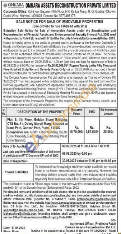 Flat- 8, 4th Floor, Golden Stone Building. CTS No. 41, Dokey Maruti Marg, Situated at Nana Peth, Ganesh Peth, Pune 411002 Boundaries are: North: Other Building, South: Other Property, East: Dokey Maruti Marg, West: Other Building