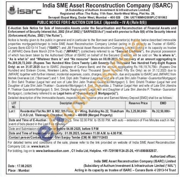 Residential Flat No.901 & 902; 9th Floor, B-Wing, Building No.22, Tilakdham C.H.S Ltd. Tilaknagar, Chembur, Mumbai-400089 (Merged Property)