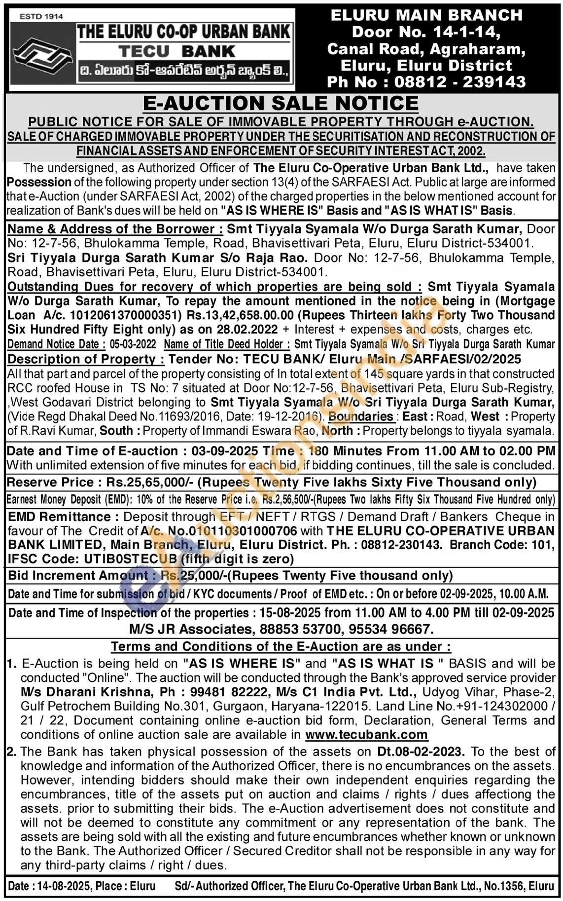 Tender No: TECU BANK/ Eluru Main /SARFAESI/02/2025 All that part and parcel of the property consisting of In total extent of 145 square yards in that constructed RCC roofed House in TS No: 7 situated at Door No: 12-7-56, Bhavisettivari Peta, Eluru Sub-Registry, West Godavari District belonging to Smt Tiyyala Syamala W/o Sri Tiyyala Durga Sarath Kumar, (Vide Regd Dhakal Deed No. 11693/2016, Date: 19-12-2016). Boundaries: East: Road, West: Property of R.Ravi Kumar, South: Property of Immandi Eswara Rao, North: Property belongs to tiyyala syamala.