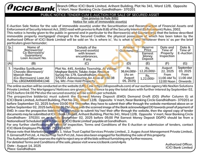 Plot No. 445, Ambika Township, At Village-Meghpar Borichi, Taluko-Anjar, Revenue Survey No 179, Gandhidham, Gujarat -370201 Admeasuring An Area of 100.38 Sq. Mtr.-Free Hold Property
