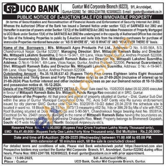 All that piece and parcel of property situated at Guntur - Dist, Guntur Sub Dist within the area of Guntur Municipal Corporation D.No. 7/C, Acre 5-87 Cents vide Re survey endorsement issued by city planner GMC Guntur vide TSA No. 832/2018-19-G3 dated 28.04.2018 the schedule site is located in ward no. 18 Block No. 28 TS No. 1973/13 measuring 462 Sq. Yds or 386.29 Sq Mits of site with RCC Roof Building situated at Door No. 5-90-56 and 5-90-56/1, Chandramouli Nagar bearing Asst No. 05081/A, Electrical Sn No. 29461 property standing in the name of Mittapalli Ramesh Babu having the boundaries as: East: Property belongs to Putcha Adishesha Chalapathi Rao, West: Property belongs to Bhimenedi Gopalah, South: 40 ft wide Municipal Road, North: Bodapati Anjaneyulu etc's.