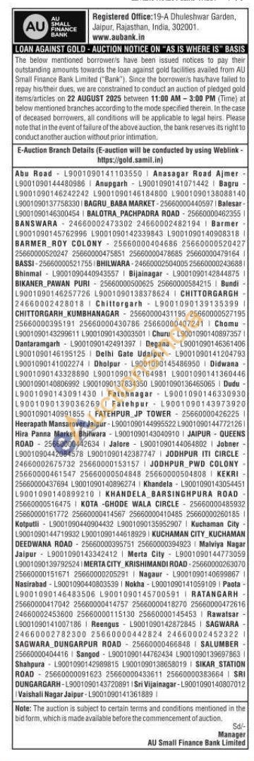 AU Small Finance Bank Gold Auctions Auction in Ajmer