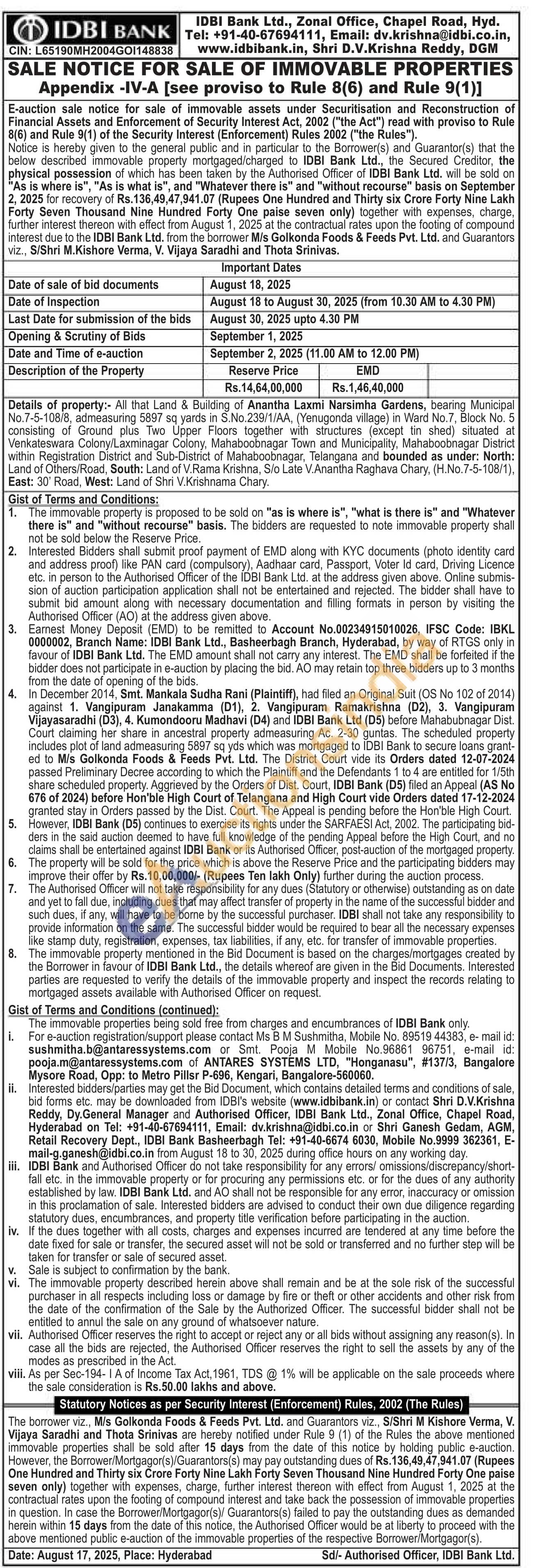 Details of property: All thal Land & Bulding of Anantha Laxmi Narsimha Gardens, bearing Municipal No-7-5-108/8 1818, admeasuring 5897 sq yards in S. No.235/TIAA, (Yenuganda village) in Ward No.7, Block No. Vilage) in Ward No.7. Block No. consisting of Ground plus Two Upper Floom together with structures (excect in shed situated af enkateswara Color lony/Laxminagar Colony, Mahaboobnagar Town and Municipality, aboobnagar Distric within Registration District and Sub-District of Mahaboobnagar Telangana and bounded as under: North: of Others/Road, South: Land of V.Rama Krishna, Slo Late V.Anantha Ragnava Chary, (H.No.7-5-108(1), 30 Road, West: Land of Shri V.Krishnama Chary