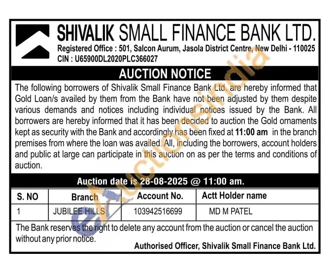Shivalik Small Finance Bank Ltd Gold Auctions Auction in New Delhi