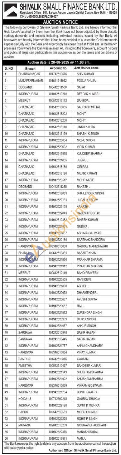 Shivalik Small Finance Bank Ltd Gold Auctions Auction in New Delhi