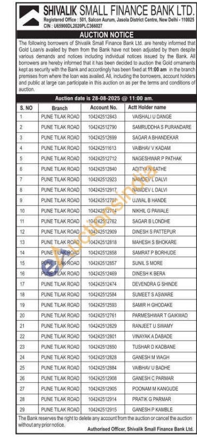 Shivalik Small Finance Bank Ltd Gold Auctions Auction in Pune