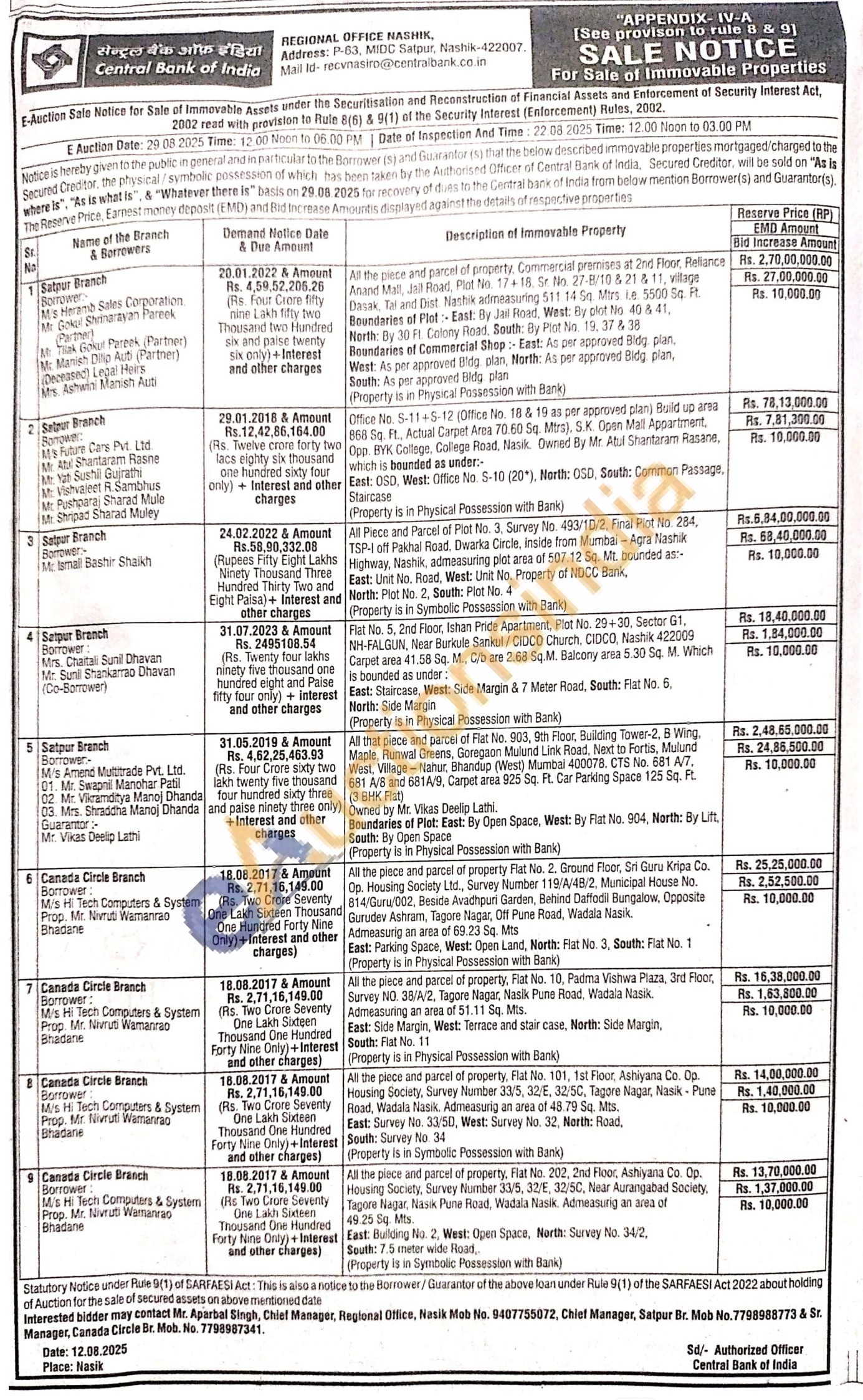 Contact Mr. Aparbal Singh, Chief Manager, Regional Office, Nasik Mob No. 9407755072, Chief Manager, Satpur Br. Mob No.7798988773 & Sr. Manager, Canada Circle Br. Mob. No. 7798987341.