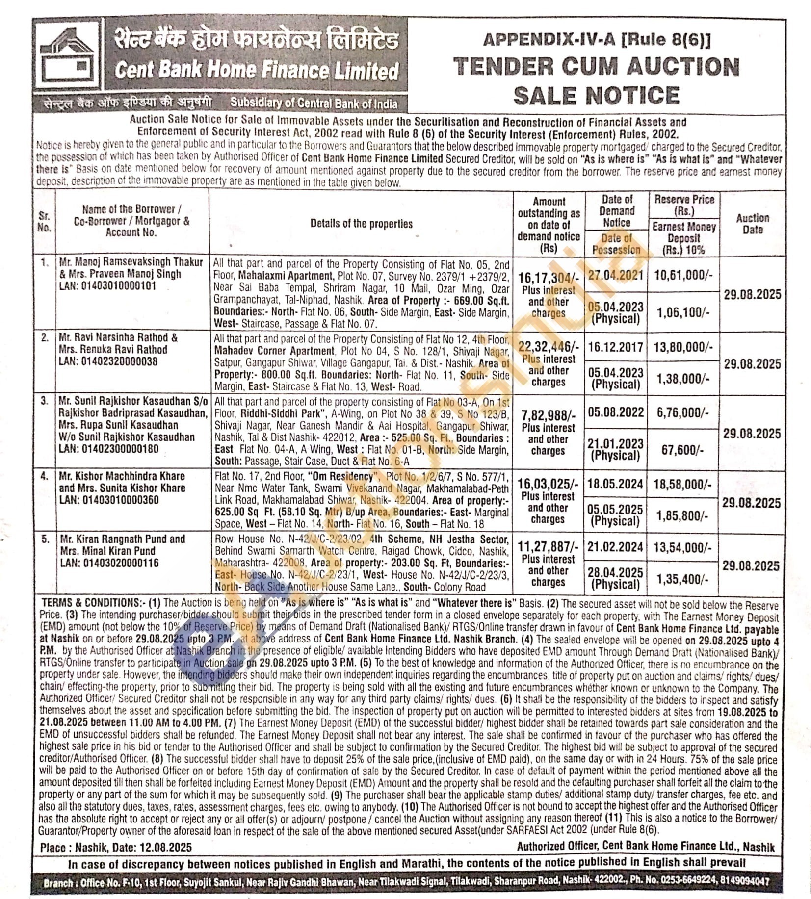 2) All that part and parcel of the Property Consisting of Flat No 12, 4th Floor, Mahadev Corner Apartment, Plot No 04, S No. 128/1, Shivaji Nagar, Satpur, Gangapur Shiwar, Village Gangapur, Tai. & Dist.- Nashik. Area of Property: 800.00 Sq.ft. Boundaries: North Flat No. 11, South- Side Margin, East-Staircase & Flat No. 13, West-Road.