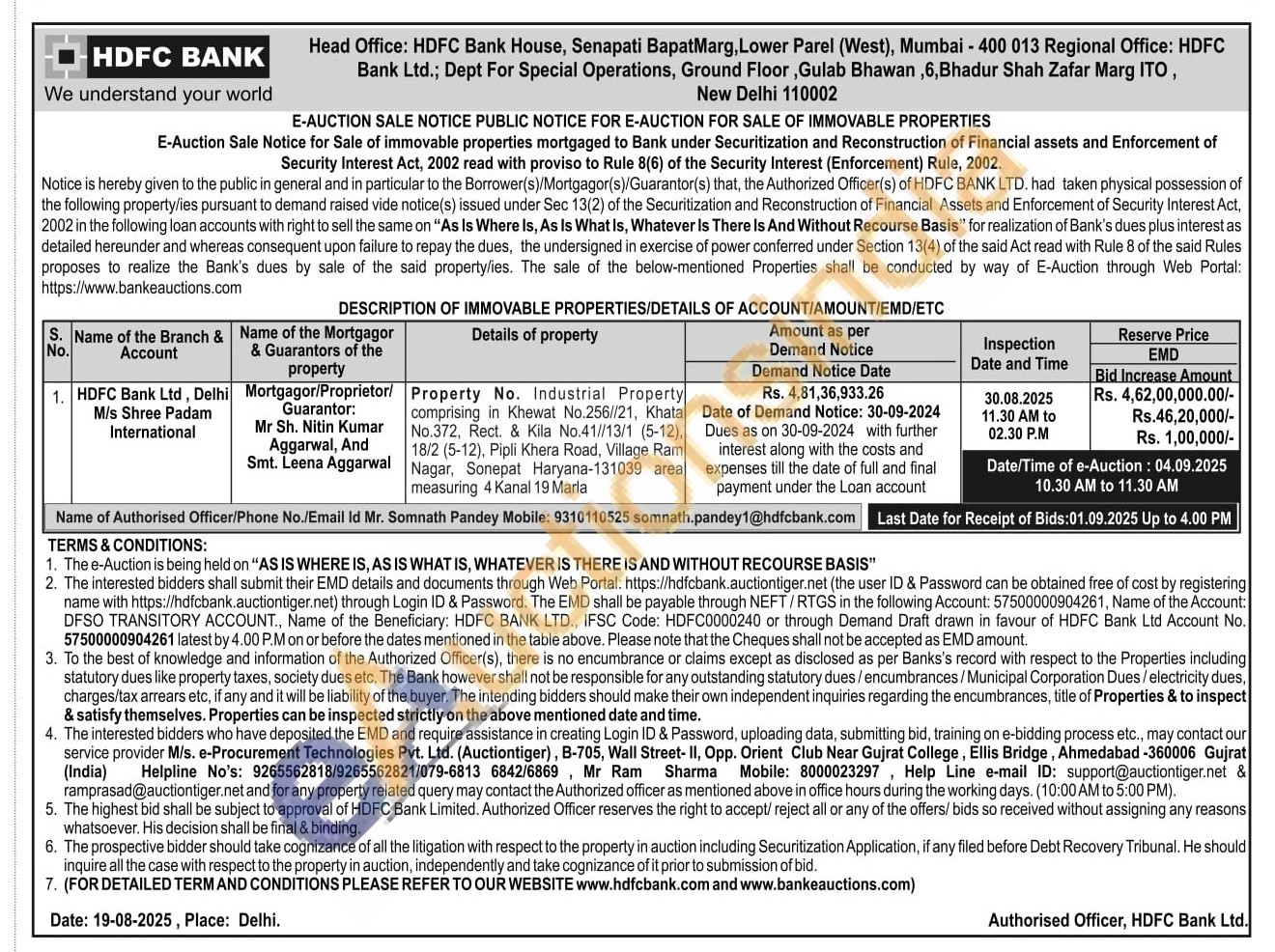 Industrial Property comprising in Khewat No.256//21, Khata No.372, Rect. & Kila No.41//13/1 (5-12), 18/2 (5-12), Pipli Khera Road, Village Ram Nagar, Sonepat Haryana-131039 area measuring 4 Kanal 19 Maria