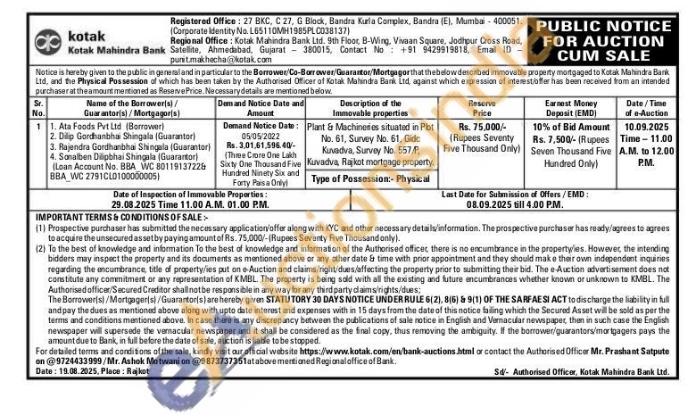 Plant & Machineries situated in Plot No. 61, Survey No. 61, Gidc Kuvadva, Survey No. 557/P, Kuvadva, Rajkot mortgage property.