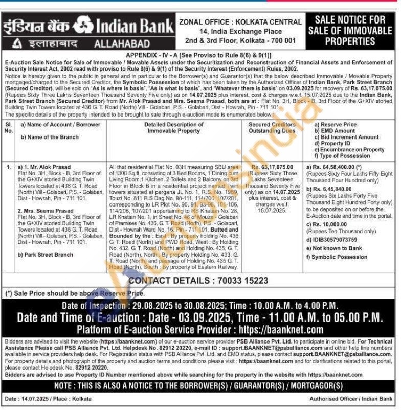 All that residential Flat No. 03H measuring SBU area of 1300 Sq.ft. consisting of 3 Bed Rooms, 1 Dining cum Living Room, 1 Kitchen, 2 Toilets and 2 Balcony on 3rd Floor in Block B in a residential project named Twin towers situated at pargana JL No. 1. R.S. No. 1989, Touzi No. 811 R.S Dag No. 98-111, 114/206, 107/201, corresponding to LR Plot No. 90, 91, 93-98, 101-106, 114/206, 107/201 appertaining to RS Khatian No. 28, LR Khatian No. 1, in Sheet No. 46 of Mouza-Golabari of Premises No. 436. G. T. Road (North), P.S.-Golabari, Dist-Howrah Ward No. 16, Pin-711 101. Butted and Bounded by the East By property holding No. 436 G. T. Road (North) and PWD Road, West: By Holding No. 432, G. T. Road (North) and Holding No. 435, G. T. Road (North), North By property Holding No. 433, G. T. Road (North) and passage of Holding No. 435 G. T. Road (North), South: By property of Eastern Railway.
