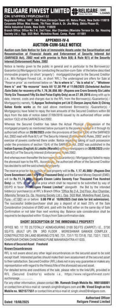 OFFICE NO. 17 TO 23, TOTALLY ADMEASURING 2100 SQ.FTS (CARPET) 1.E 2730 SQ.FTS (BUILT UP) ON 3RD FLOOR MORESHWAR GAWADE COMPLEX. CONSTRUCTED ON LAND BEARING GTS NO. 731, 731/1 ΤΟ 731/8, 732, 732/1,732/2, CHAPEKAR CHOWK CHINCHWAD PUNE MAHARASHTRA 411033.