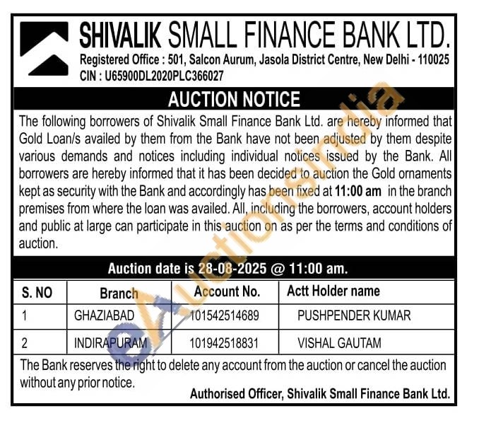 Shivalik Small Finance Bank Ltd Gold Auctions Auction in Ghaziabad